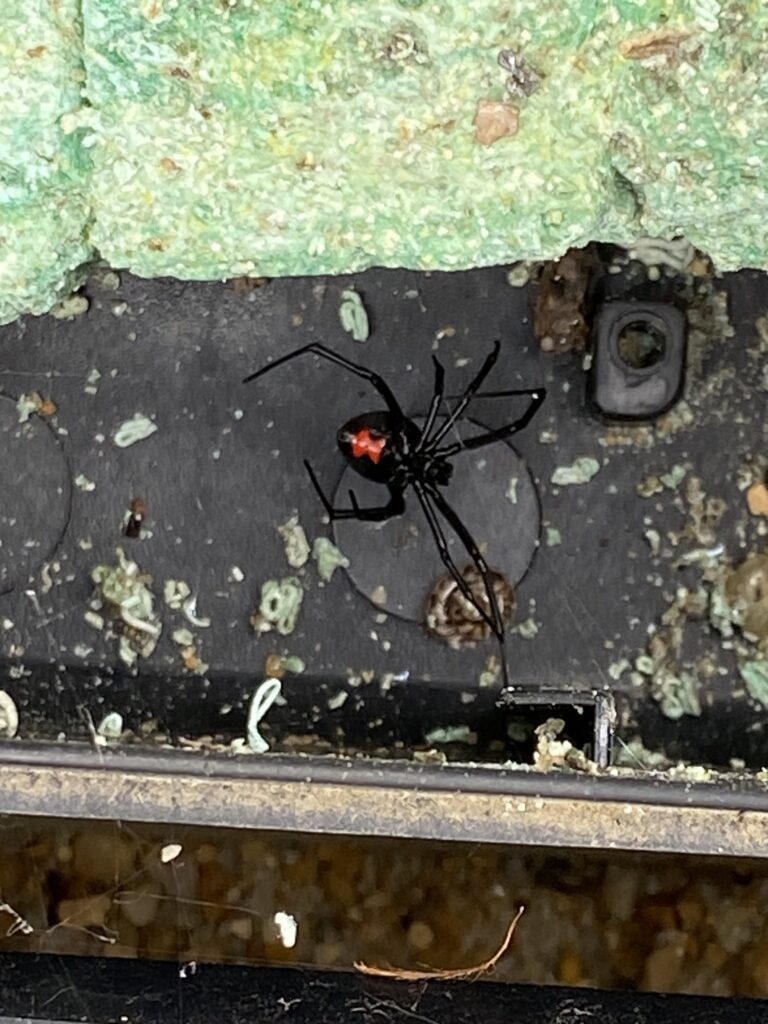 This is a black widow spider — one of the most recognizable (and venomous) spiders found around homes in our area.